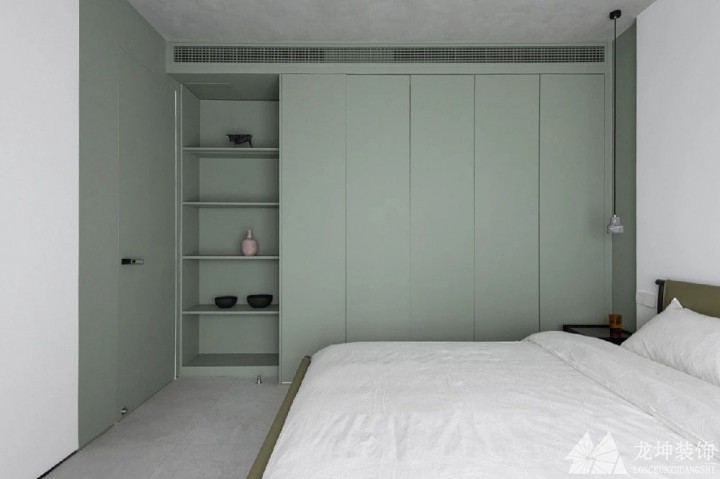 臥室右側的儲物空間使用了沉穩的灰綠色,左側則是大面積的留白處理,防止了空間顏色太過單調,綠色也為整個臥室添加了一絲活力。