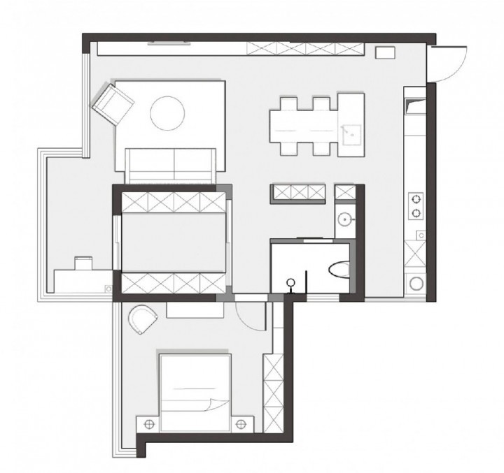 原戶型為一套89㎡的兩居室,不過空間實在是太緊湊了,所以龍坤設計師將原本的兩居室改成了更加通透的一居室,使整個戶型更加開放且流暢。