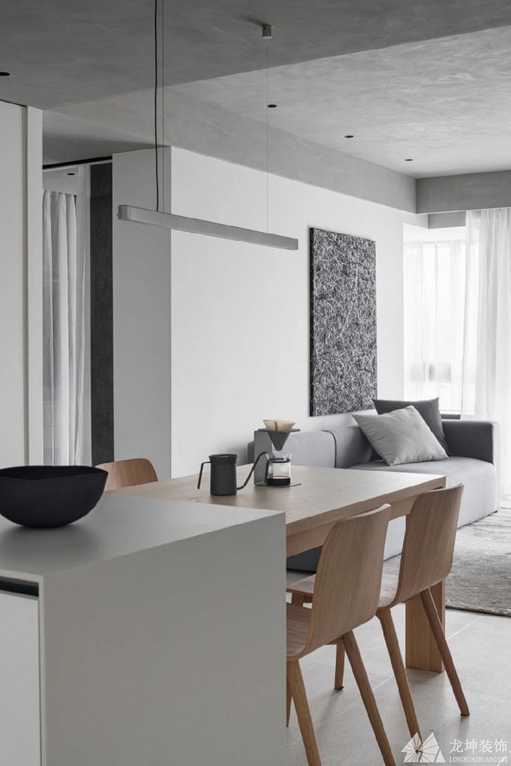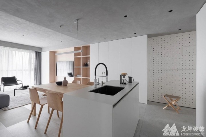 中島的設計,將廚房和餐廳兩個空間連在一起,區別于別處的白灰搭配,餐桌和餐椅用了原木材質,更加貼近自然。