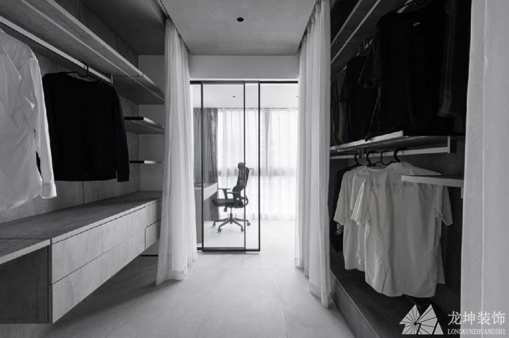 衣帽間的設計延續了整屋的顏色,采用了黑白灰三色的設計。通過電動的布簾,感應燈等設計給生活一些不一樣的體驗感。