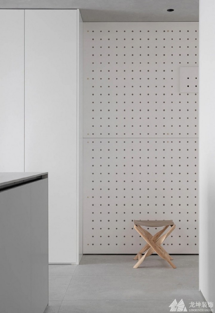 玄關右側整面墻都做成了連通到陽臺的整體鞋柜,靠近入口的一部分做成了洞洞墻,方便業主回到家之后掛一些小部件。