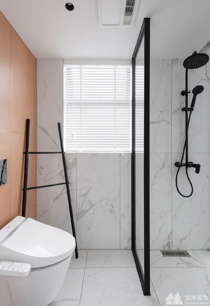 衛生間采用了無軌道式幽靈門,既能保持私密性還能凸顯裝飾性,而且還省去了門套的設計,顯得更加高級。