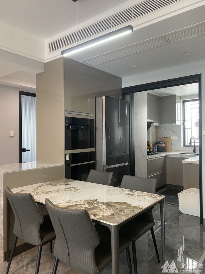 餐廳與廚房連接,大理石臺面與簡約的線條燈展現出不復雜卻又精致的美感。