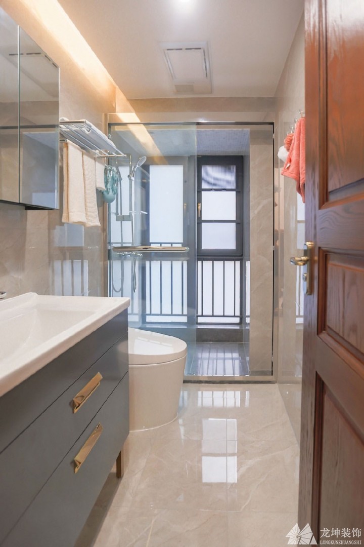 衛(wèi)生間以米黃色為主色調(diào),點(diǎn)綴以溫柔美好的灰藍(lán)色為浴室柜加入一份高級(jí)質(zhì)感,鏡柜的設(shè)計(jì)既滿足了儲(chǔ)物又勾勒著精致生活。