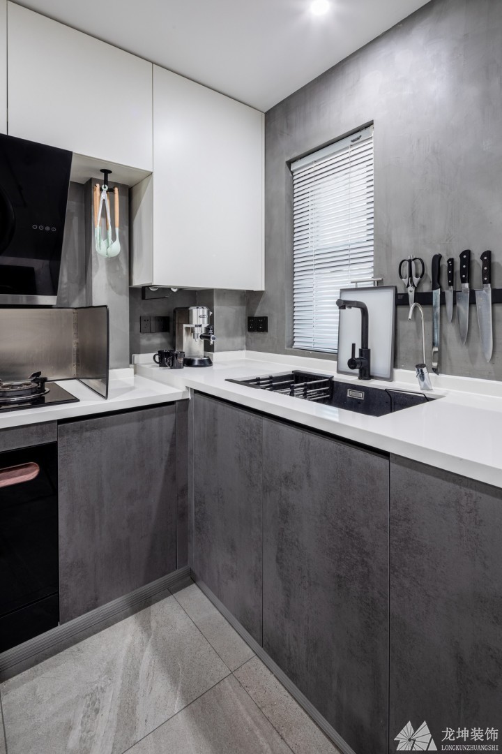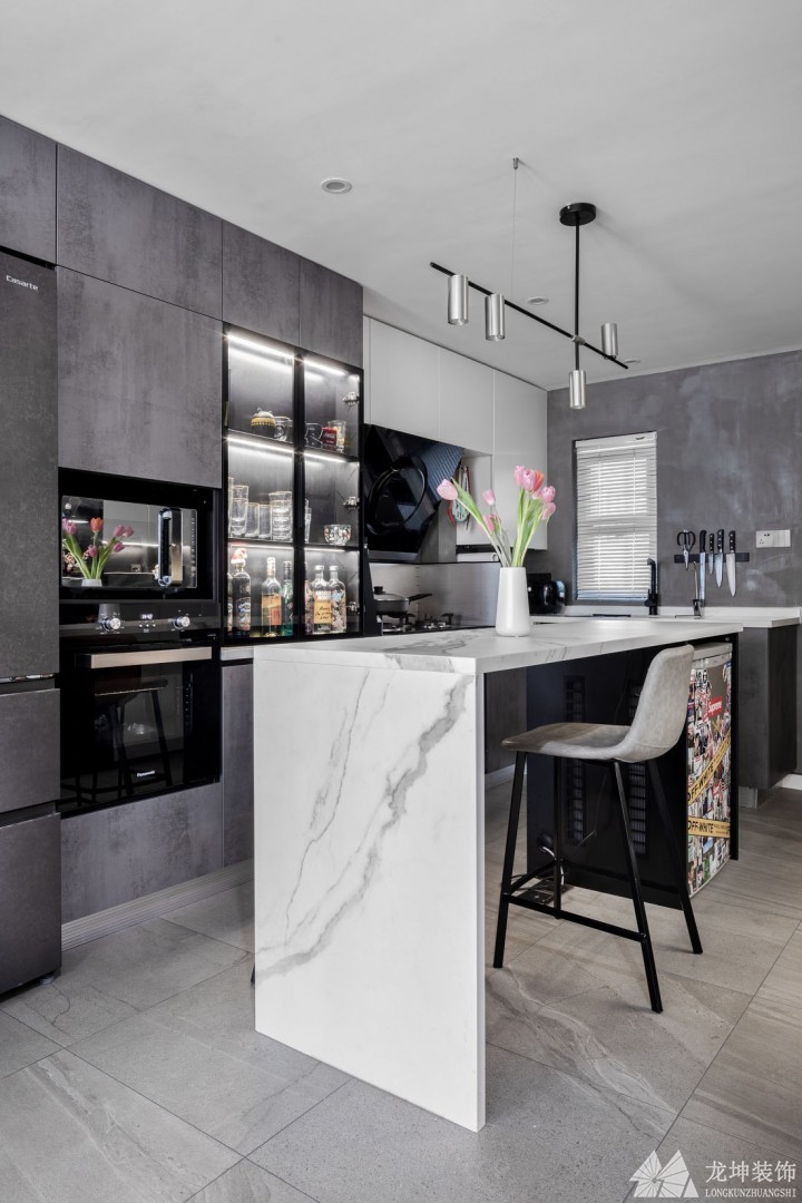 廚房一側安裝整墻定制柜,封閉柜門+黑波柜門組合設計,增加空間層次感。柜體專為各式廚房家電留出空間,洗碗機、烤箱、蒸箱一應俱全,讓愛美食的主人盡享烹飪的樂趣。