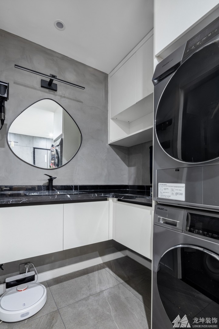 有衛生間狹小逼仄,向客廳借用部分空間后,打造為四分離衛生間,洗手區增加烘洗衣機,同時也是小型洗衣房。
