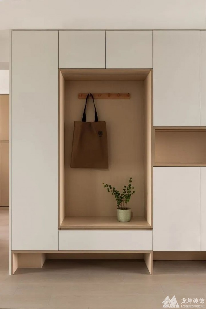玄關做了大平頂設計,到頂的柜子,再結合完美的收納,營造出一個干凈整潔的玄關氛圍。