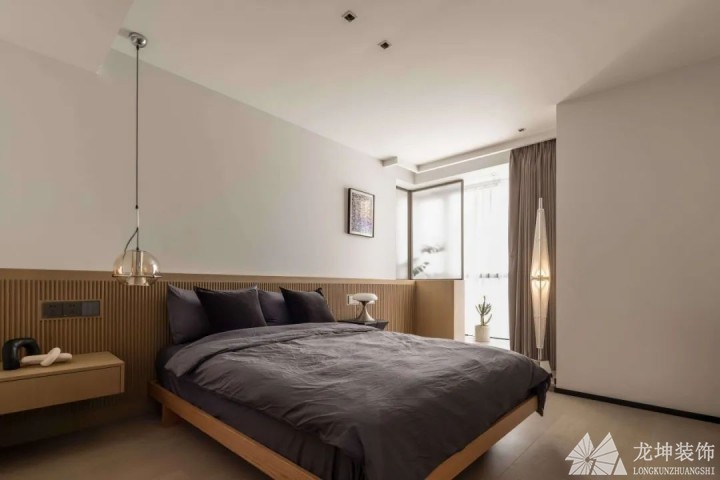 主臥的床頭做了木色格柵拉高了整個空間,再搭配無靠背的成品木床,縱向的空間也仿佛變大了。