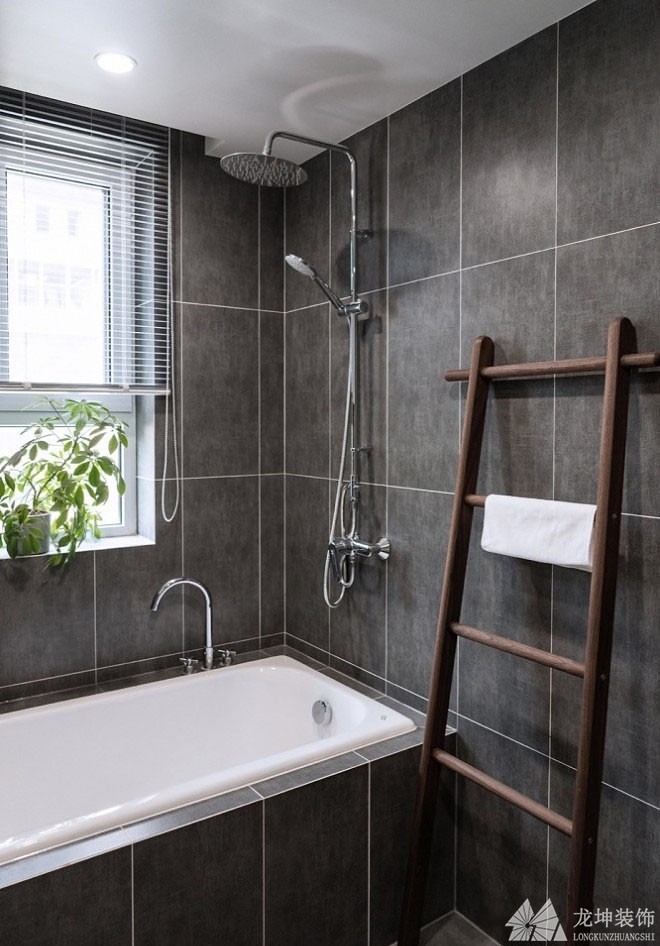 黑色瓷磚通鋪深沉中帶著素雅,增加浴缸,淋浴泡澡皆可。