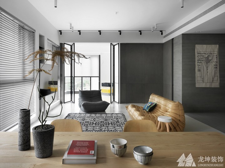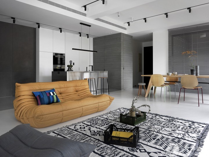 沙發和餐桌之間沒有任何區分,但是沙發對面的墻面已然確定了客廳的空間。