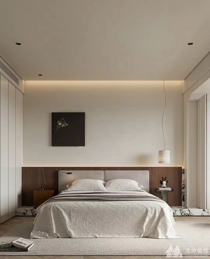 1、吊頂設計成弧形,可以更柔和的銜接旁邊平頂,床頭用實木+硬包,打造線條感!