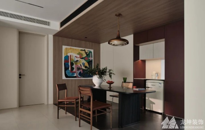 5、餐廳如果做餐邊柜不要做傳統(tǒng)的網(wǎng)格酒柜,做通頂設(shè)計(jì)還能作為儲(chǔ)物柜,中間開放處理還能安裝軌道插座,小家電使用更方便。