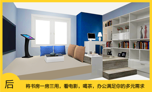 利用臺階,制造高低層次分區效果,隔開辦公區和影音區,增加整體空間感
